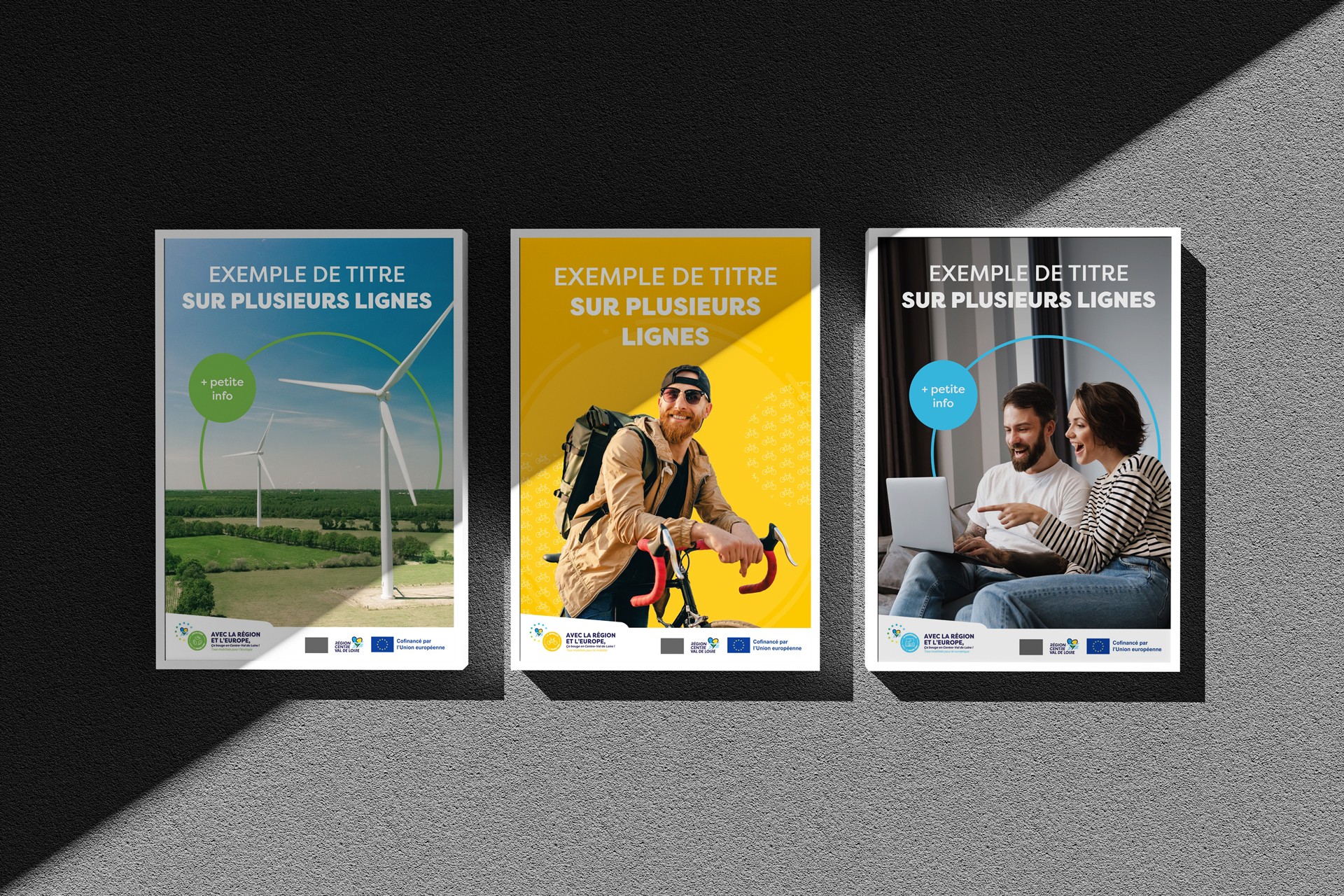 L'enjeu était de créer une identité capable de fédérer des centaines d'acteurs ; communes, entreprises, associations ; autour d'une communication cohérente. Elle fusionne les codes visuels de l'Union Européenne et de la région pour ancrer ces programmes dans le territoire. Le système graphique repose sur des formes circulaires en superposition, un code couleur par axe thématique et une photographie ancrée dans le quotidien des habitants. Modulaire et évolutif, il permet à chaque acteur régional de communiquer avec cohérence, quelle que soit la thématique ou le support.
